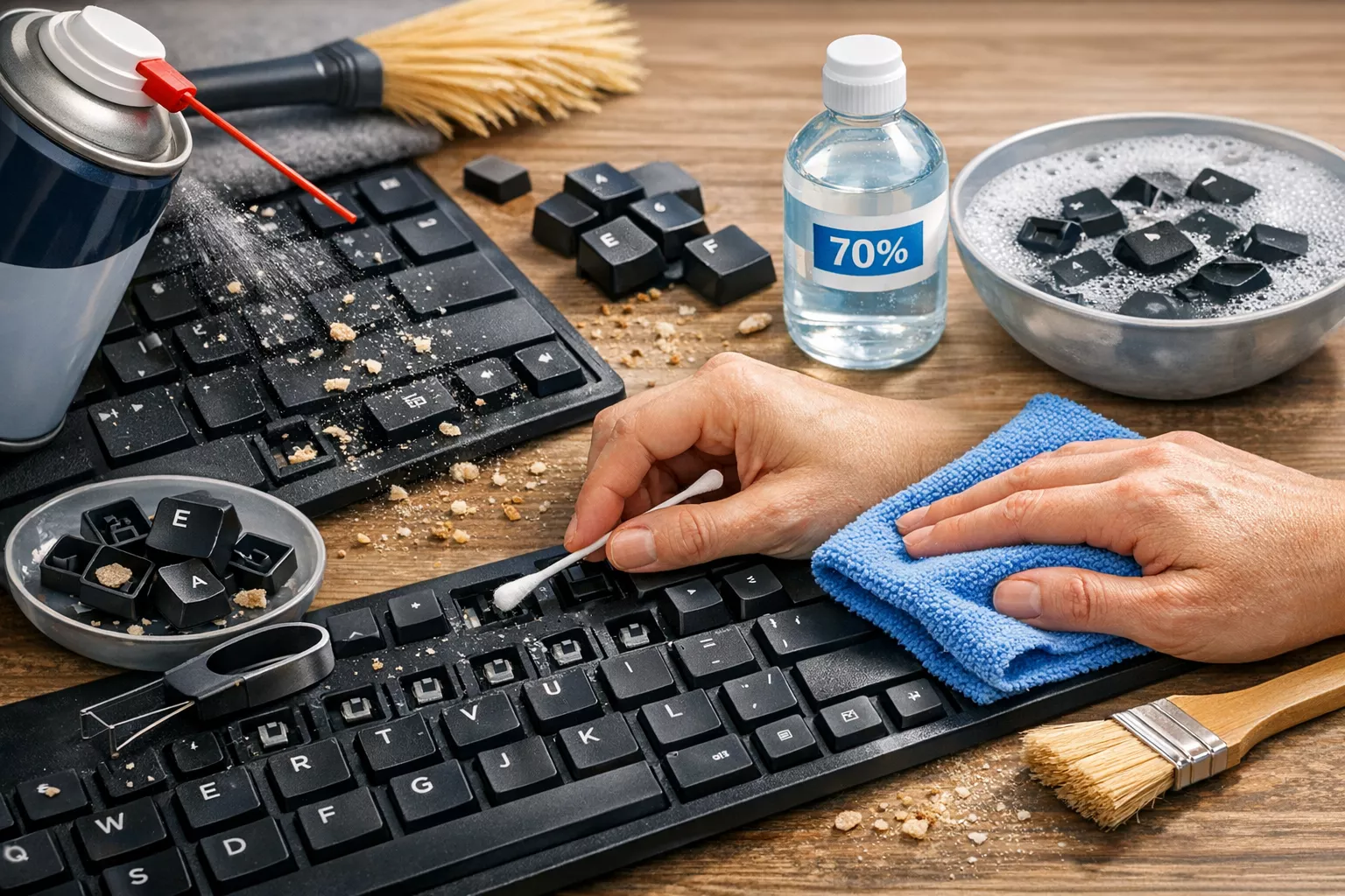 Cette méthode concerne principalement les claviers mécaniques externes, dont les touches (keycaps) se retirent facilement et sans risque. Elle est recommandée lorsque le clavier n’a pas été nettoyé depuis plusieurs mois, ou après un renversement important de liquide.